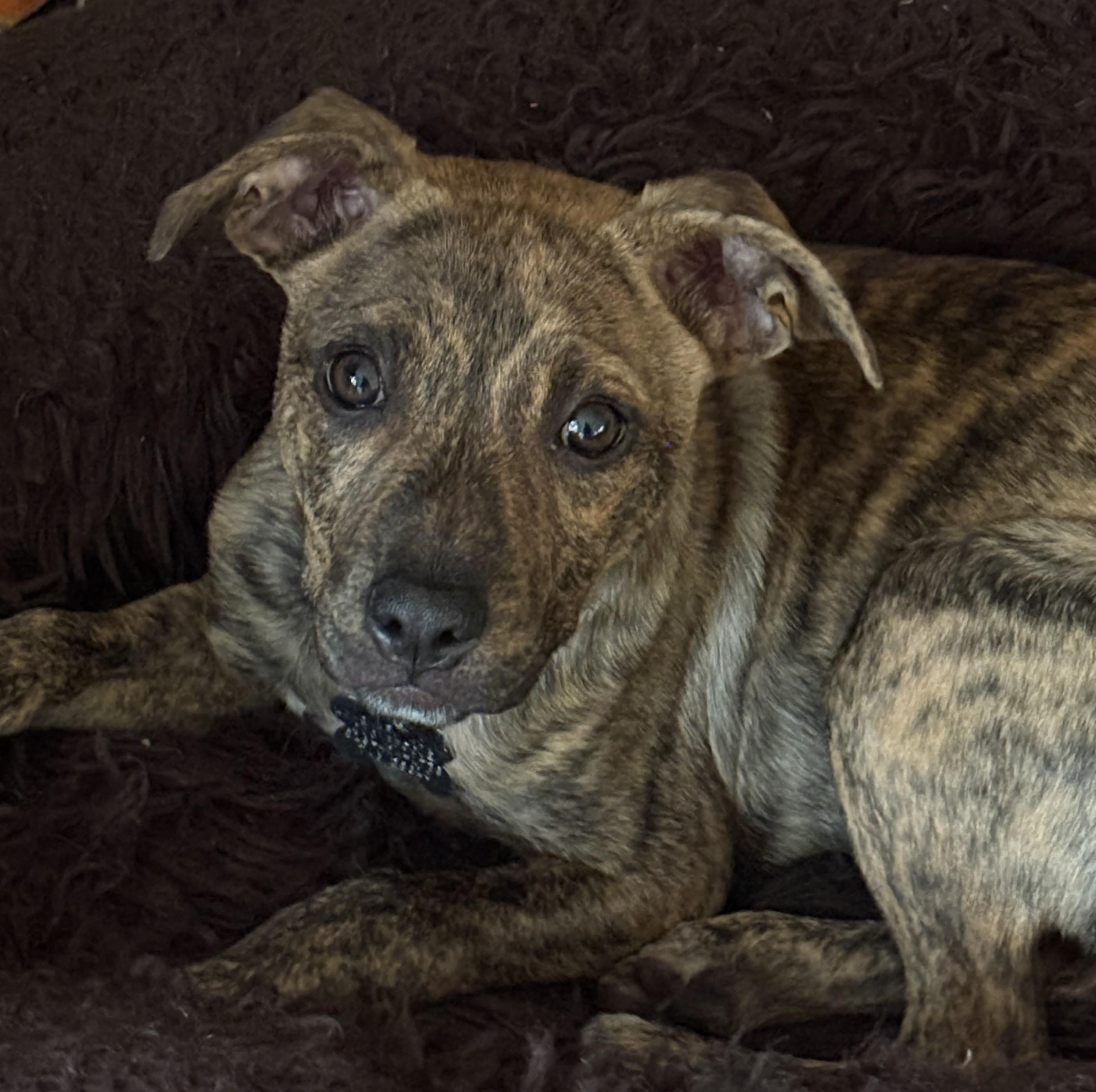 Meet the adorably brave Chicken Wrap! 🐶 This little bundle of joy is on a heart-wrapping mission, and trust me, she’s already got her ninja skills down! Once a pup battling the odds with parvo, she’s now a healthy ball of energy, ready to spread joy in her forever home. 🌟 Now, Chicken Wrap might be a little teething tornado with her sharp puppy teeth, so she's looking for a home with older kids who can appreciate her silliness but steer clear of those tiny fingers. Just imagine her playful spirit wrapped around your heart – you’ll never get away! 🥰 You better believe this curious gal knows how to explore! Fences? Pfft, she’ll show you where her little legs can wriggle through! You’ll want to keep an eye on this one! She adores outdoor adventures, especially playing with her brother and savoring the taste of grass (who knew grass could be gourmet? 🌱). Perched on stilt-like legs, Chicken Wrap is a goofy little creature; her clumsy antics are sure to make you chuckle as she runs and tumbles. This brindled beauty, with her perky ears begging for attention, is practically a dream come true for those looking to save on grooming costs! A simple bath and a nail clip and she’s ready to shine! ✨ And if you’re wondering, she’s doing fantastic with potty pads daily but is eager to explore the outdoors when nature calls. So, if you’re seeking a delightful companion to nurture and help grow into a spectacular adult pup full of love and slobbery kisses, Chicken Wrap has your name written all over her little heart! ❤️ To bring this happy girl into your home, make sure to apply through the Buddy App!